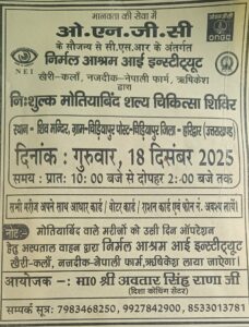 निशुल्क नेत्र शिविर 18दिसंबर(कल) चिड़ियापुर में होगा आयोजित