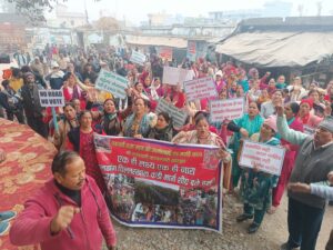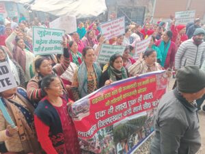लालढांग चिल्लर खाल वन मोटर मार्ग निर्माण को आन्दोलित महिला व पुरूषो ने लालढांग के गांधी चौक पर एक दिवसीय धरना दिया ।
