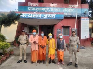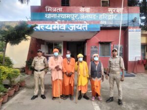 माननीय मुख्यमंत्री उत्तराखण्ड़ द्वारा राज्य में चलाये जा रहे *”ऑपरेशन कालनेमी”* अभियान के क्रम में वरिष्ठ पुलिस अधीक्षक हरिद्वार* के आदेशानुसार थानाध्यक्ष श्यामपुर के कुशल नेतृत्व में थाना श्यामपुर हरिद्वार पुलिस द्वारा को नमामि गंगेघाट चण्ड़ीघाट में चैकिंग के दौरान बहरुपी बाबा जो बाबा/साधु का भेष धारण कर सार्वजनिक स्थानों में आने-जाने वाले स्थानीय लोगों व पर्यटकों को रोककर उन्हें तन्त्र- मन्त्र, जादू -टोना आदि की कलायें दिखाकर अपनी ओर आकर्षित कर रहे थे। जिससे उक्त स्थान पर काफी भीड़-भाड़ उत्पन्न होने के कारण इन बेहरुपी बाबाओं के उक्त कृत्य से स्थानीय लोगों एवं पर्यटकों/ यात्रियों के भड़कने/उग्र होने की होने की सम्भावना के दृष्टिगत थाना श्यामपुर  पुलिस टीममें  म0उ0नि0 अंजना चौहान का0 राजवीर सिंहका0 अनिल रावत द्वारा नमामि गंगे घाट चण्ड़ीघाट से 04 बेहरुपी बाबाओं को गिरफ्तार कर थाना श्यामपुर लाया गया पूछताछ में उन्होंने अपना नाम योगेश पुत्र श्री प्रेम सिंह नि0 मनोरा थाना निधोलीकरा जनपद एटा उ0प्र0, हाल पता- हरकी पैड़ी कोतवाली नगर हरिद्वार जनपद हरिद्वार, उम्र 52 वर्ष शिव कुमार वर्मा पुत्र श्री दूधनाथ वर्मा नि0 दुबेपुर थाना हनुमानगंज जनपद सुल्तानपुर उ0प्र0, हाल पता- हरकी पैड़ी कोतवाली नगर हरिद्वार जनपद हरिद्वार, उम्र 55 वर्ष जयेश मिश्रा पुत्र श्री बिहारी लाल नि0 चौक बाजार सूरत गुजरात उ0प्र0, हाल पता- हरकी पैड़ी कोतवाली नगर हरिद्वार जनपद हरिद्वार, उम्र 59 वर्ष भावराव पुत्र श्री दादूजी मडावीर नि0 जयताला थाना येमाईडीसी नागपुर महाराष्ट्र, हाल पता- हरकी पैड़ी कोतवाली नगर हरिद्वार जनपद हरिद्वार, उम्र 59 वर्ष बताया