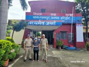 थाना श्यामपुर पुलिस ने रविवार को चैकिंग/गशत के दौरान चण्डीघाट नहर पटरी टी प्वाइंट के पास से एक युवक को 1अवैध चाकू सहित गिरफ्तार कर थाना श्यामपुर लाया गया पूछताछ में उसने अपना नामअश्वनी पुत्र लोकचन्द निवासी मौहल्ला वाल्मिकी बस्ती थाना अमरोहा जिला अमरोहा उ0प्र0 हाल पता इन्द्रा नगर बस्ती इन्डस्ट्रीयल एरिया थाना कोतवाली नगर हरिद्वार उम्र-25 वर्ष बताया।