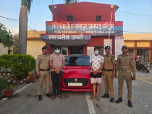 कोतवाली श्याम पुर पुलिस ने मंगलवार को लाहडपुर पुलिस चैकपोस्ट पर चेकिंग करते हुए लाल रंग की कार को रोका तो कार में तीन युवक सवार थे पुलिस ने कार की चेकिंग की तो कार के शीशो पर काली फिल्म व कार पर हुटर लगाकर चल रहे थे पुलिस ने उनसे पूछताछ की तो संतोषजनक उत्तर नहीं दे पाए पुलिस ने कार स०DL2CBB3257 के शीशो से काली फिल्म व हुटर हटवा कर कार सहित तीनों युवकों को थाना श्यामपुर लेकर आयी। पूछताछ में उन्होंने अपना नाम विनीत 23 वर्षपुत्र आनंद त्यागी निवासी बनेड़ा खुर्द गाजियाबाद , पियूष त्यागी22 वर्ष पुत्र महेश चंद त्यागी निवासी राहिद्रा जनपद मेरठ, शिवम त्यागी 28वर्ष पुत्र कुलदीप त्यागी निवासी रेंद्र जनपद मेरठ बताया।